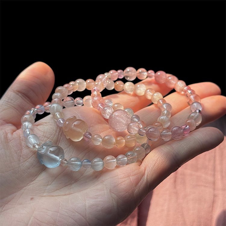 在調和排列時,發現比起純藍色的兔毛與藍線石,珍珠光兔毛與粉橙色碧璽的比例,更能影響我如何去描繪心中的藍天形象。